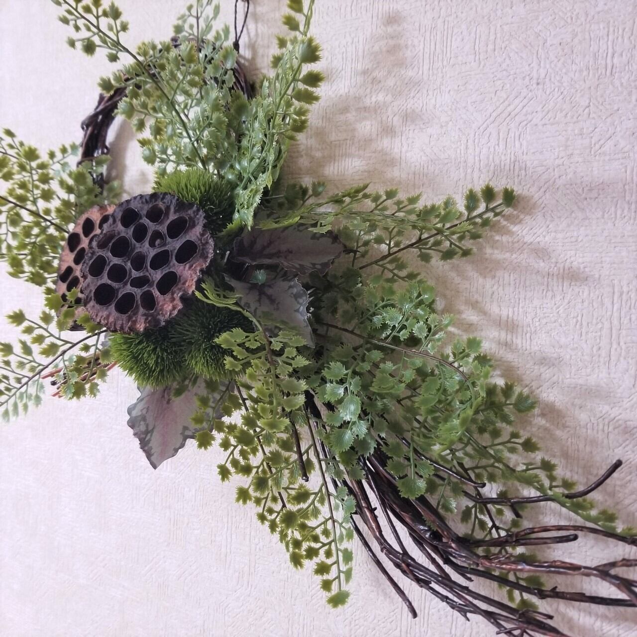 ドライの蓮の実と繊細な葉が涼しげなアジアンタム、まんまるフォルムが可愛らしい