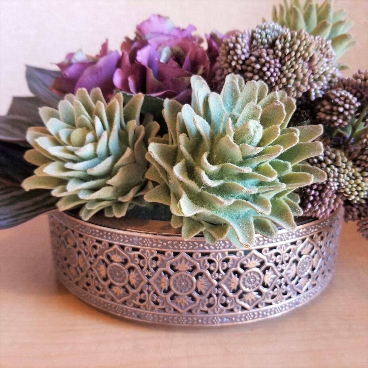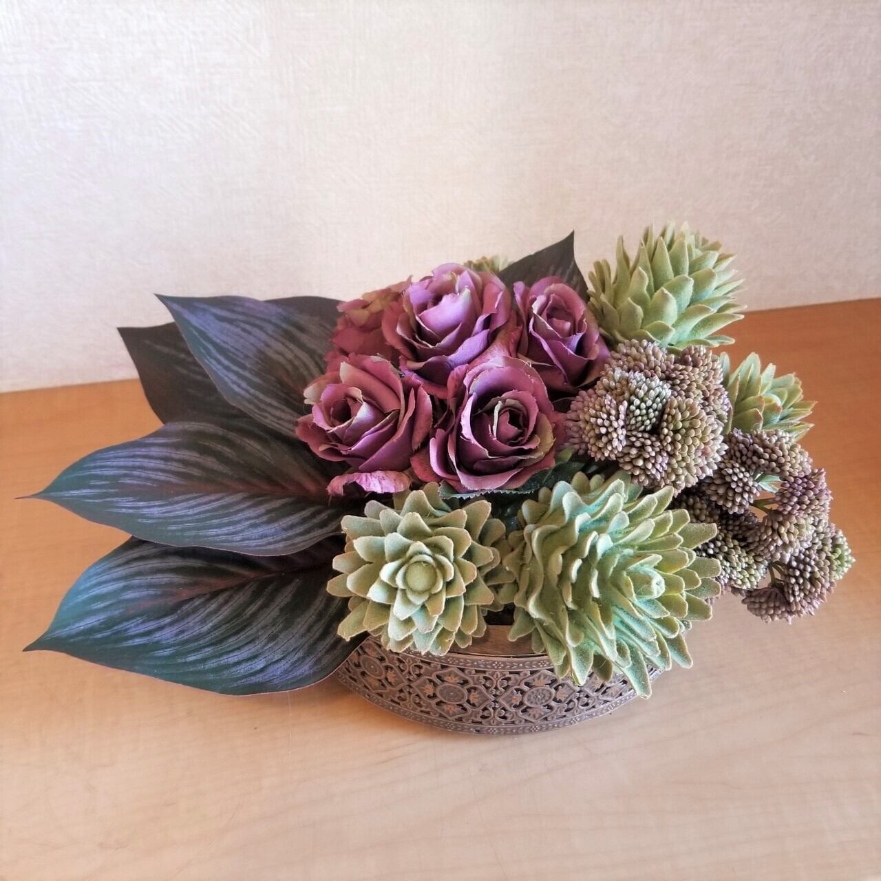 シックなカラーのローズと個性的なアーティチョークをアラビアンベースに盛ったテーブルアレンジメントです♪どことなくオリエンタルな雰囲気・・落ち着いた色合いですが、華やかさと上品さ溢れるアレンジメントです・・・お祝い事や返礼品としてもオススメです!