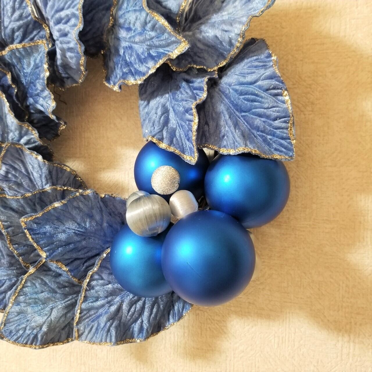 鮮やかなブルーのベルベットリーフを贅沢にあしらった煌びやかなリースになります♪